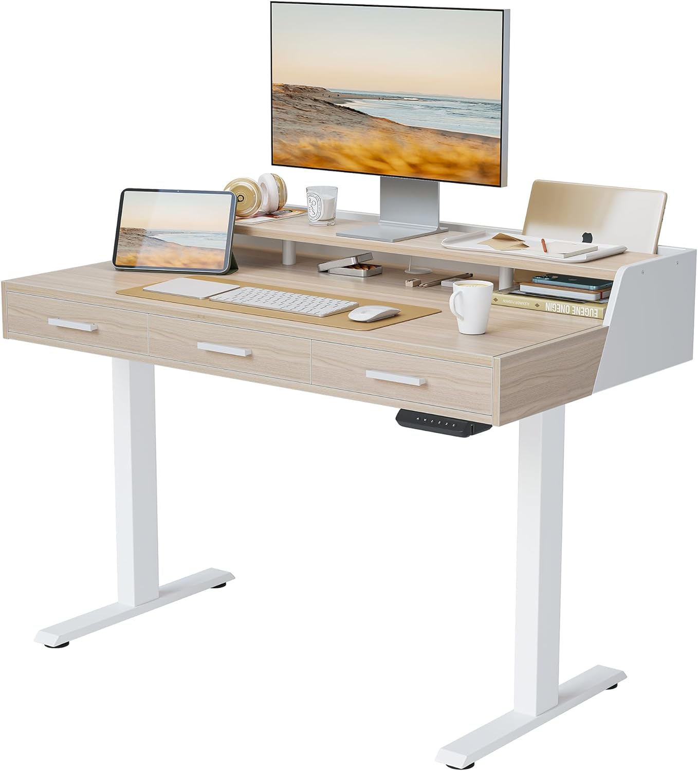 FEZIBO Electric Standing Desk with Drawers, 55×26 Inch Adjustable Height, Stand Up Desk with Monitor Shelf, Sit Stand Home Office Desk, Light Walnut